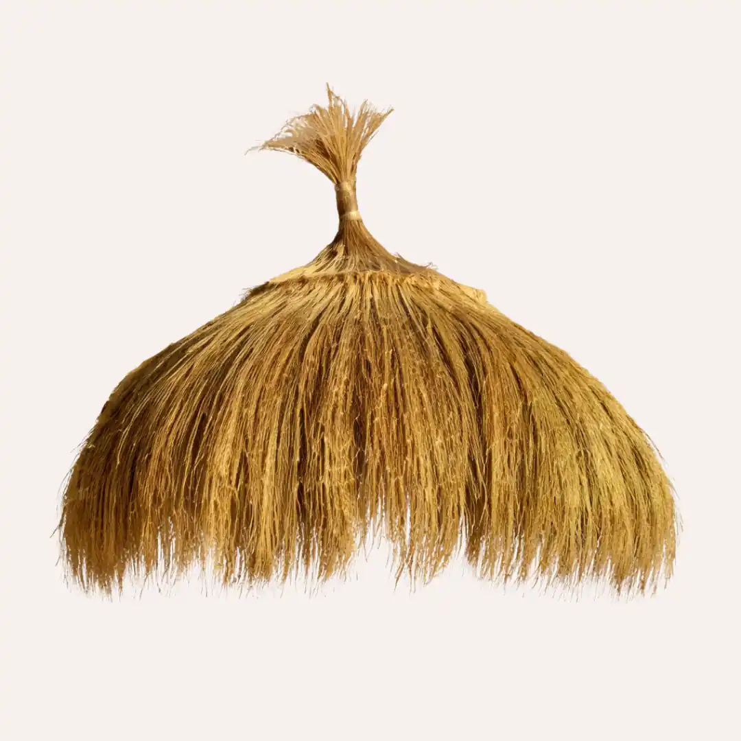 Sombrilla de playa de carritx. Parasol de fibras naturales de carritx tejido, parasol exótico, con moño central y flecos.